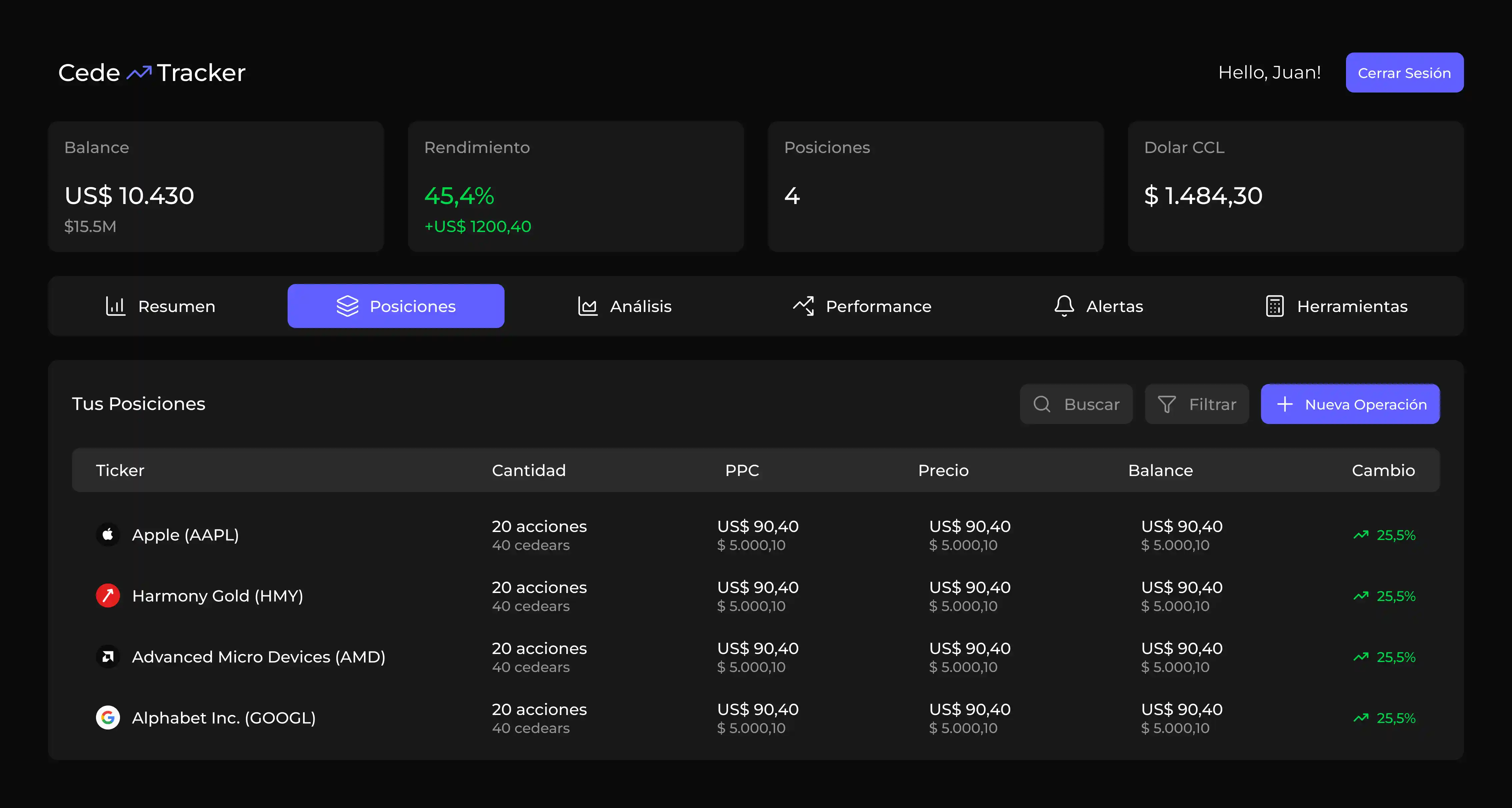 Financial tracking app for Argentine CEDEAR investors. Built with a Hono.js backend that pulls real-time stock data from exchange APIs and Google Sheets, with cronjobs handling automated price updates. PostgreSQL stores portfolio data, deployed on GCP.